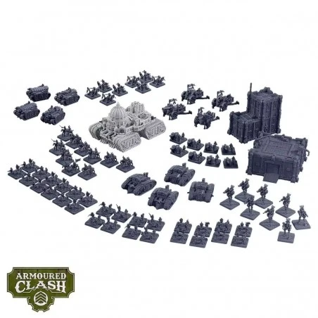 Ce coffret de démarrage contient tout ce qu’il faut pour commencer à jouer à Armoured Clash, en prenant le commandement des puissants Dominions de la Couronne. Sous la bannière de la reine Victoria, les pelotons d’infanterie de Sa Majesté exécutent des salves impitoyables, tandis que la cavalerie de la Garde à Cheval charge sabres au clair. Les robustes chars Galahad avancent sans relâche, soutenus par les terribles explosions de l’artillerie lourde Mordred. Dominant le champ de bataille, le navire terrestre souverain écrase tout sur son passage, qu’il s’agisse de véhicules, de fortifications ou d’infanterie.