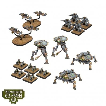 Dans cette boîte de régiment Armoured Clash, vous trouverez un soutien lourd pour vos forces Éclairées. Les Tripodes de bataille Mars avancent vers l’ennemi, prêts à libérer des faisceaux d’énergie incandescente capables de désintégrer tout sur leur passage. Sur les flancs du champ de bataille, les meutes de K9 Gun Dog traquent les cibles légères, atteignant ceux qui pensaient naïvement être en sécurité à l’écart des lignes de front. Dans les cieux, les Sickle Gyro CAV patrouillent sans relâche, scrutant l’horizon à la recherche de cibles vulnérables avant de fondre sur elles pour exploiter leur avantage stratégique.