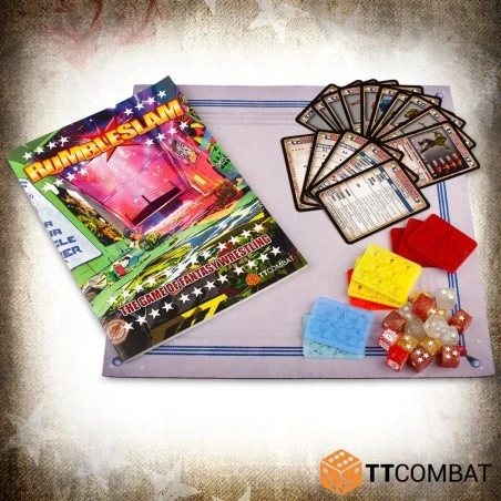 Ce coffret contient tout le nécessaire pour plonger directement dans l’univers de RUMBLESLAM. Vous y trouverez un livret de règles de deuxième édition, entièrement mis à jour avec de nouvelles règles de trébuchement et d’immobilisation. Le coffret comprend également deux équipes de figurines finement détaillées, des cartes de personnages pour chaque lutteur, des dés personnalisés, des jetons, et même un tapis de ring en néoprène pour jouer.